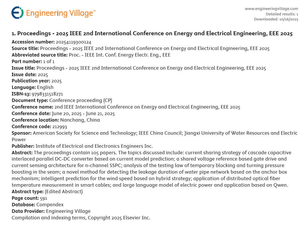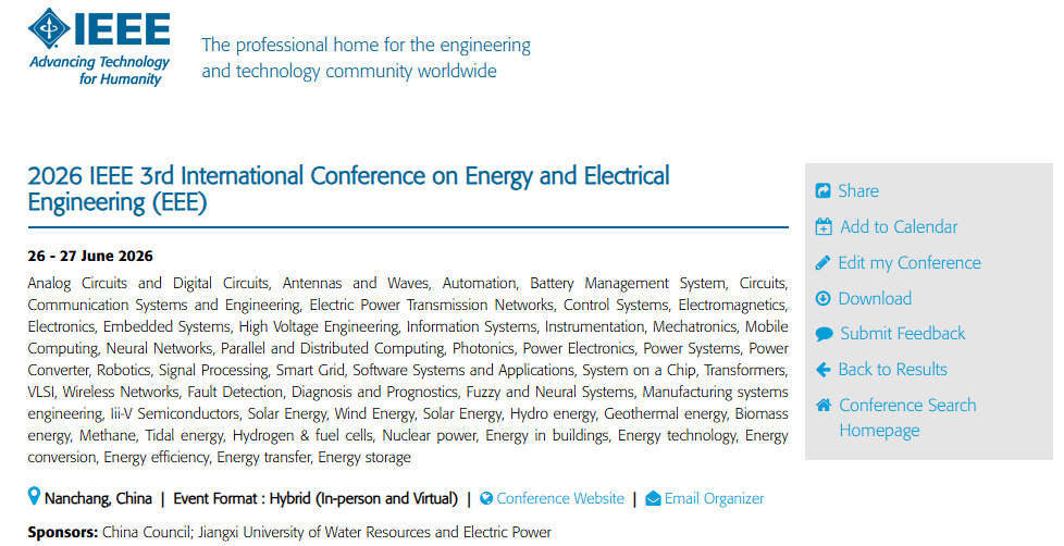 为共同探讨能源与电气工程相关理论和实践问题,增进同行间的相互了解与交流,“IEEE第三届能源与电气工程国际学术会议(EEE 2025)”将于 2025 年 6 月 26-27 日在中国南昌举办。本次会议将邀请相关领域的国内外著名专家学者参会,以主题报告、口头报告和墙报等形式开展多领域同行间的学术交流。