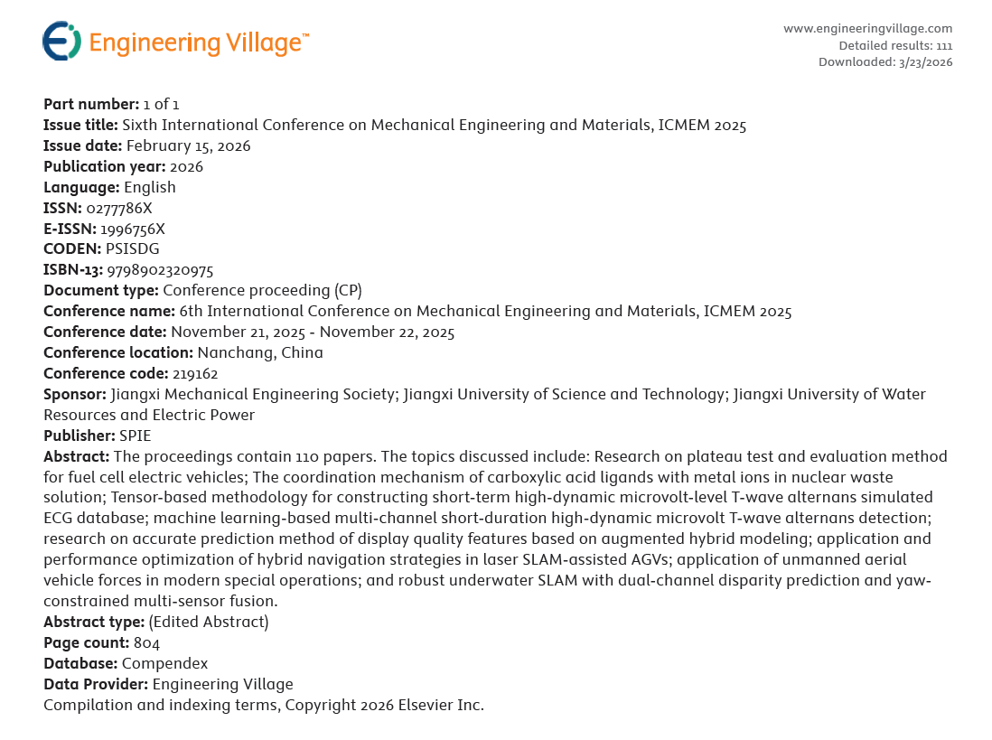 ICMEM 2025、ICMEM 2024、ICMEM 2023、ICMEM 2022、ICMEM 2021 、ICMEM 2020 已被EI检索。