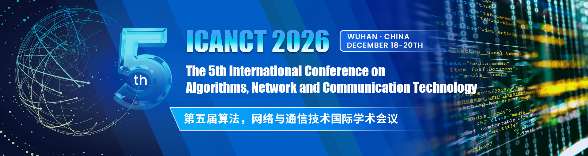 为推动全球算法、网络与通信技术的发展, 共同探讨该领域的前沿技术和热点, 2026第五届算法,网络与通信技术国际学术会议将于2026年12月18-20日在中国武汉举行。会议旨在为来自国内外高等院校、科研机构、企事业单位的专家学者们提供一个分享专业经验、面对面交流及展示研究成果的国际平台。本次会议将邀请相关领域的国内外著名专家学者参会,以主题报告、口头报告和墙报等形式开展多领域同行间的学术交流。我们相信,通过本次会议的深入交流与探讨,将进一步推动算法、网络与通信领域的创新发展。